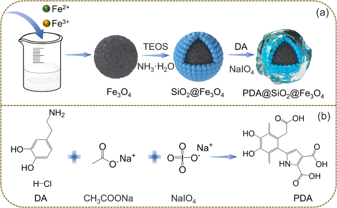 首先通过共沉淀法合成Fe3O4磁性纳米颗粒,随后使用正硅酸乙酯(TEOS)在其表面沉积了SiO2,获得SiO2@Fe3O4 MNPs,然后以NaIO4作为氧化剂,加入DA制得 PDA@SiO2@Fe3O4 MNPs。 该PDA@SiO2@Fe3O4 MNPs具有优异的缓蚀性能,其缓蚀效率达到96.57%,并且在回收后仍能保持88.09%的缓蚀效率。该PDA@SiO2@Fe3O4 MNPs抑制低碳钢表面发生的阳极和阴极反应,吸附行为符合Redlich-Peterson (R-P)等温线模型,证实其为混合型抑制机理。此外,该PDA@SiO2@Fe3O4 MNPs在HCl溶液中保持稳定,同时表现出增强的耐腐蚀性能。因此,本研究解决了以往文献中高效缓蚀剂在盐酸介质中不可回收性的问题,在工业中具有广阔的应用前景。 合成示意图 (a)PDA@SiO2@Fe3O4和(b)PDA的合成。