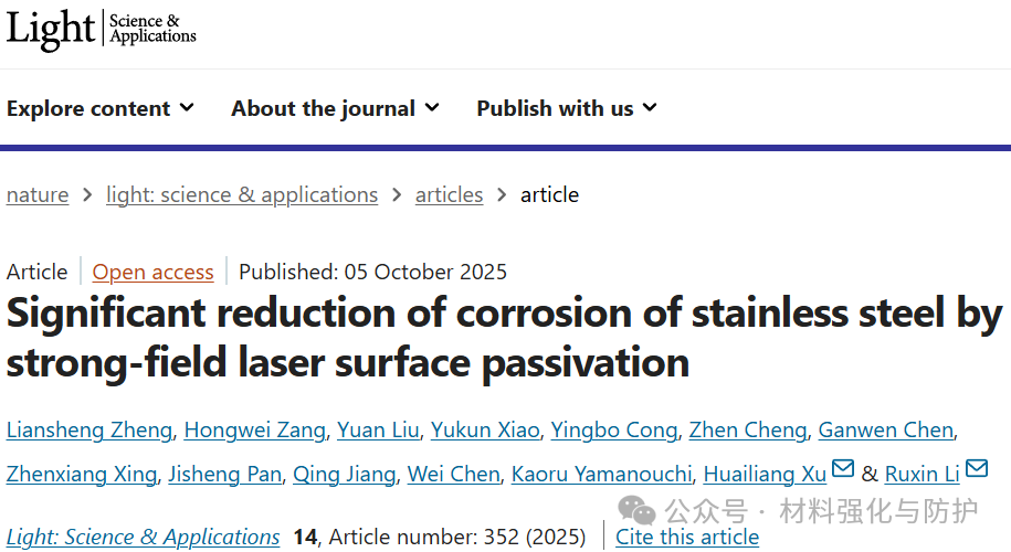 这项研究通过强场激光丝化+低温热处理,不仅在不锈钢表面构筑了高致密的复合氧化膜,更通过仿生微纳结构实现了”空气屏障”式防护,该成果揭示了“光致钝化”机制的物理过程,也为高耐蚀、长寿命的金属防护材料开发提供了全新路径。