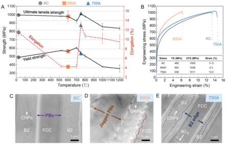 研究团队结合多尺度表征、第一性原理计算及深入分析,系统揭示了高熵合金的“韧-脆-韧”转变机制。1)L12过有序+锯齿状相界的协同脆化:研究表明,中温时效诱导L12发生过有序化,同时形成锯齿状的B2/FCC(L12)相界。一方面,L12过有序导致高度局域化的平面滑移带;另一方面,锯齿状的非共格相界严重阻碍位错跨越界面滑移,导致界面处产生应力集中。当高度局域化的平面滑移带冲击这些滑移传递不利的相界面时,局部应力迅速超过B2相的断裂极限,诱发脆性断裂。2)L12有序度降低+韧性过渡界面的协同韧化:在非脆性温度区间时效时,高扩散能力使得L12有序度降低,激活多滑移与交滑移,显著提升合金的均匀变形能力。更关键的是,锯齿状界面转变为平滑界面,并在B2/FCC(L12)相界附近形成富Cr析出相缺失区(CRPs-free zone)。该区域内的富Cr相(CRPs)在热作用下溶解消失,形成韧性过渡区,使B2相边缘与FCC(L12)基体的变形能力更为匹配,有效缓解界面应力集中。从而显著抑制局域变形和脆性开裂倾向,展现出优异的强塑性。
