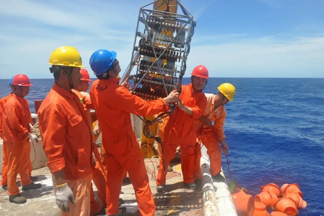 失败成为最珍贵的养料。团队对装置进行全面升级,先后投放12套新型试验装置。从近海到远海,海上作业的艰辛远超想象:项目组成员张彭辉因严重晕船,连续三天仅靠一个苹果维持,体力透支。试验现场负责人侯健出于安全考虑,果断决定临时返航。得知这一决定时,张彭辉面色苍白,声音微弱却坚定:“任务还没完成,我还能坚持。”他拒绝了特殊照顾,始终守在岗位,直到整个航次任务圆满完成。返航时,他的体重已骤降十几斤。张彭辉的坚持,是整个团队拼搏精神的缩影。其他试验人员同样在极端环境中坚守:在40℃高温、毫无遮挡的甲板上,他们长时间作业,汗水浸透工装,仍一丝不苟地记录数据,试验结束后,不少人暴露的皮肤出现大片脱皮;为抓住宝贵的窗口期,团队曾在台风间隙抢时间出海布放装置,就在设备入水的瞬间,暴雨倾盆而下……