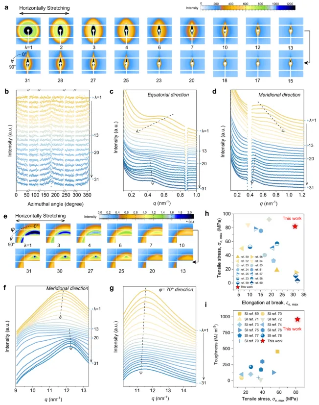 图4 | 通过SAXS和WAXS分析揭示HPWPUE的延迟结晶过程及与商业TPUE和其他WPUE的机械性能对比 a. 拉伸过程中HPWPUE的2D-SAXS图案(q≤2 nm⁻¹)。 b. 从图案(a)中提取的方位角平均曲线(q=0.10–1.11 nm⁻¹)。 c. 赤道方向(拉伸方向)的1D SAXS曲线。 d. 子午方向的1D SAXS曲线。 e. 拉伸过程中HPWPUE的2D-WAXS图案子集,赤道方向大部分被仪器遮挡。 f. 子午方向的1D-WAXS曲线。 g. q=70°方向的1D-WAXS曲线。 h. 多种可拉伸TPUE的拉伸强度与断裂伸长率散点图,符号含义详见附表4。 i. 其他WPUE的韧性与拉伸强度散点图,数据来源详见附表5。