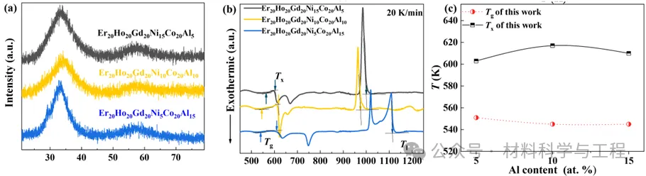 图1 (a,b)三种条带的XRD图谱和DSC曲线,(c)Tg和Tx)随Al含量变化的关系。