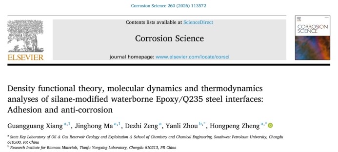 西南石油大学化学化工学院郑宏鹏副研究员长期致力于油气腐蚀防护研究,近年来围绕无机填料增强高性能防腐涂层的制备与应用,系统探究了无机/有机界面的热力学行为与应力场分布对复合涂层性能的影响。通过硅烷偶联剂改性短切玄武岩纤维(CBFs),并借助有限元模拟分析单纤维模型界面应力场,其团队预测了复合涂层的变形损伤规律;此外,利用磁性Fe3O4修饰玻璃鳞片,实现在磁场中片状填料的定向排列,形成均匀应力场,显著提升了涂层的机械性能[Surface & Coatings Technology 487 (2024) 131023; Progress in Organic Coatings 210 (2026) 109725]。在界面热力学研究方面,通过绘制水性环氧树脂“浸润-再团聚-吸附”热力学等值线图,该团队成功预测了改性纳米TiO2与CBFs在树脂中的浸润与分散行为,揭示了热力学参数变化与界面强度之间的关联,并发现了对应最强界面键合的临界热力学差值[Surface & Coatings Technology 489 (2024) 131105; Polymer Composites 46 (2025) 9213–9231]。近期,郑宏鹏与合作者系统综述了涂层固化中有机/无机界面的演变过程,阐述了采用密度泛函理论(DFT)、分子模拟(MS)及热力学等值线方法在揭示界面失效机制方面的潜力,并通过上述方法对硅烷偶联剂改性体系的研究,初步验证了基于原子尺度模拟与热力学理论预测涂层短期与长期服役性能的可行性[Corrosion Science 260 (2026) 113572]。