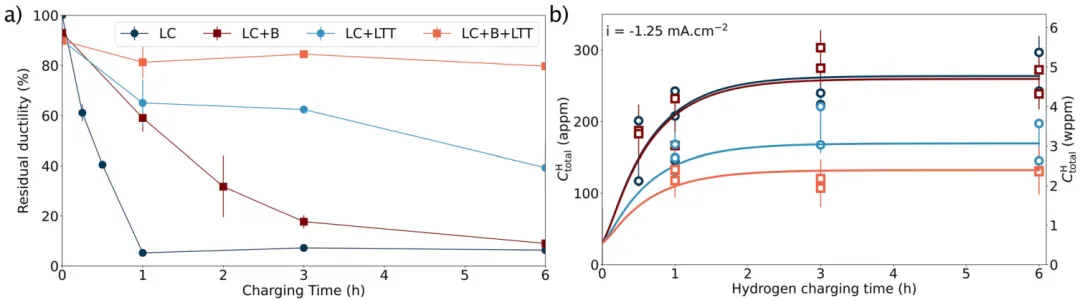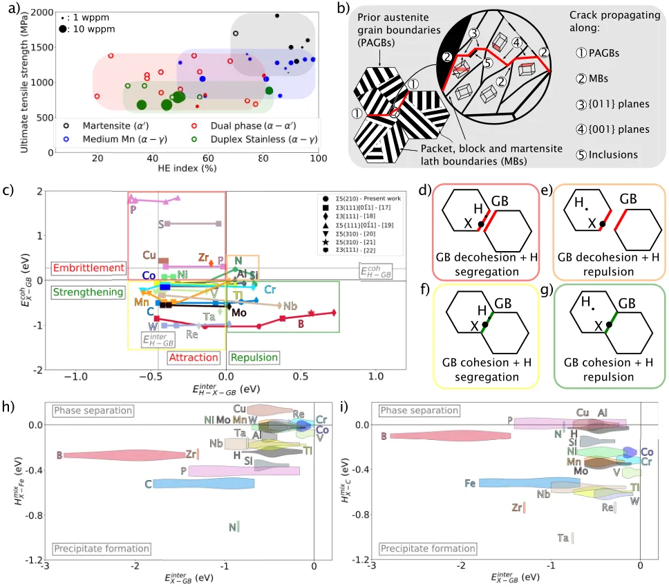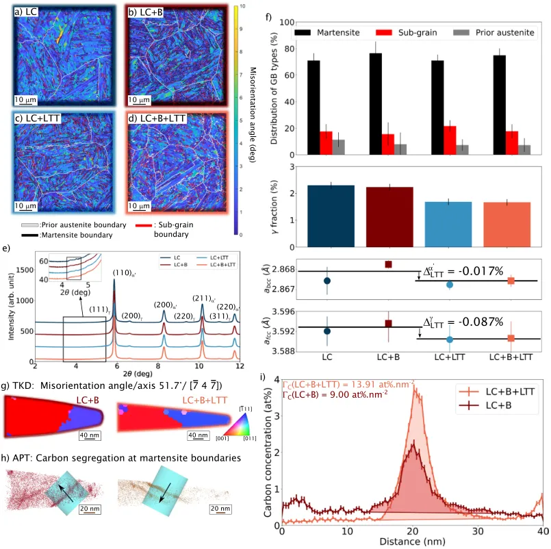 图1:本图展示了为钢中界面选择最合适溶质以防止氢偏聚的策略。图a比较了不同组织钢的氢脆指数与抗拉强度,突显了马氏体钢的高敏感性。图b示意了马氏体钢中氢致裂纹扩展的主要路径。图c是核心设计图,通过绘制溶质掺杂晶界的结合能与氢-掺杂晶界相互作用能的关系,筛选出能强化界面并排斥氢的最佳溶质(如硼和碳)。图d和图e则通过混合焓分析,评估了溶质与铁基体或碳形成沉淀相的倾向,进一步确定了硼和碳作为最适宜溶质。 02 图2:本图系统表征了添加硼和进行低温回火对低碳马氏体钢显微组织的影响。通过EBSD和同步辐射XRD分析,证明了硼的添加和回火处理对晶粒尺寸、晶界类型分布和位错密度影响有限。APT分析则定量揭示了硼在原奥氏体晶界以及碳在马氏体板条界上的偏聚。同步辐射结果还表明,低温回火通过碳的再分配和残余奥氏体体积分数的减少,实现了微观应力的弛豫。 03 图3:本图评估了不同处理工艺对材料抗氢脆性能和氢吸收量的影响。通过慢应变速率拉伸试验和热脱附光谱(TDS)测试发现,单独添加硼或进行低温回火均能提升残余延展性。而将二者结合(LC+B+LTT)则表现出显著的协同效应,使残余延展性始终保持在80%以上,同时将饱和氢含量降低至120 appm,表明通过界面偏聚和应力弛豫有效降低了氢的渗入。 04 图4:本图通过对氢充填后拉伸试样中二次裂纹的路径分析,揭示了硼和碳偏聚对改善抗氢脆性能的作用机制。分析表明,添加硼后,沿原奥氏体晶界开裂的比例大幅下降至10%以下,证明了硼对强化该类界面的有效性。在同时添加硼和回火的最佳条件下,裂纹更倾向于在马氏体板条界和夹杂物/基体界面处扩展,说明碳偏聚对马氏体界的保护作用为部分缓解而非完全阻止。 05 图5:本图探讨了残余奥氏体及其在变形过程中的稳定性对氢脆行为的影响。通过APT和EBSD证明了残余奥氏体以薄膜形式存在于马氏体板条界,并具有化学成分不均匀性。同步辐射XRD分析发现,氢的存在会诱发未回火钢中残余奥氏体在较低应变下发生形变诱导马氏体相变(DIMT),这被认为是氢脆的诱因之一。而经低温回火后,由于应力弛豫和可能的碳偏聚,残余奥氏体稳定性增强,未观察到氢诱导的早期DIMT,从而提升了抗氢脆性。