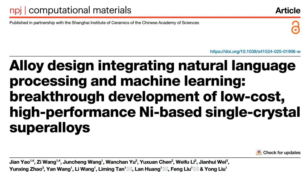 近日,中南大学粉末冶金全国重点实验室高温合金研究团队在国际知名期刊npj Computational Materials上在线发表了题为“融合自然语言处理与机器学习的合金设计:低成本高性能镍基单晶高温合金的突破性开发(Alloy design integrating natural language processing and machine learning: breakthrough development of low-cost, high-performance Ni-based single-crystal superalloys)”的研究论文。 ‘ 单晶高温合金是制造航空发动机和燃气轮机热端部件的关键材料,其研发长期依赖耗时且昂贵的“试错法”。关键性能数据如γ′相溶解温度散落在浩如烟海的科学文献中,难以高效利用,形成了制约新材料研发的数据瓶颈。针对这一挑战,研究团队创新性地提出了一种“知识到创新”的智能合金设计新范式。