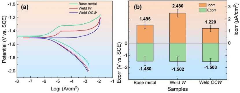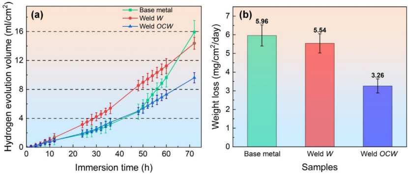 背景:镁合金具有低密度、高比强度及优良的阻尼性能,是航空航天、通信及生物医药领域不可或缺的关键材料。然而,由于其固有的活性化学性质,在腐蚀性环境中容易腐蚀,严重阻碍了其广泛应用。此外,这种腐蚀敏感性在镁合金焊缝处表现得尤为突出。焊接过程中,快速且复杂的热循环会使焊缝形成非平衡组织,同时产生残余应力与冶金缺陷,这些因素均会成为优先腐蚀位点,进而进一步降低焊缝的耐蚀性。
