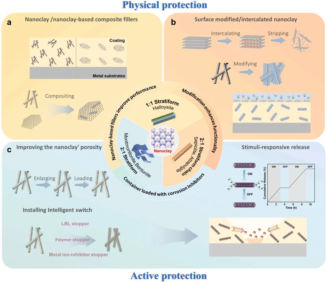 自2015年以来纳米粘土在防腐领域的应用进展,主要分为:(1) 被动纳米粘土填料,(2) 功能化纳米粘土基复合填料,以及 (3) 用于主动防护的智能纳米粘土容器。