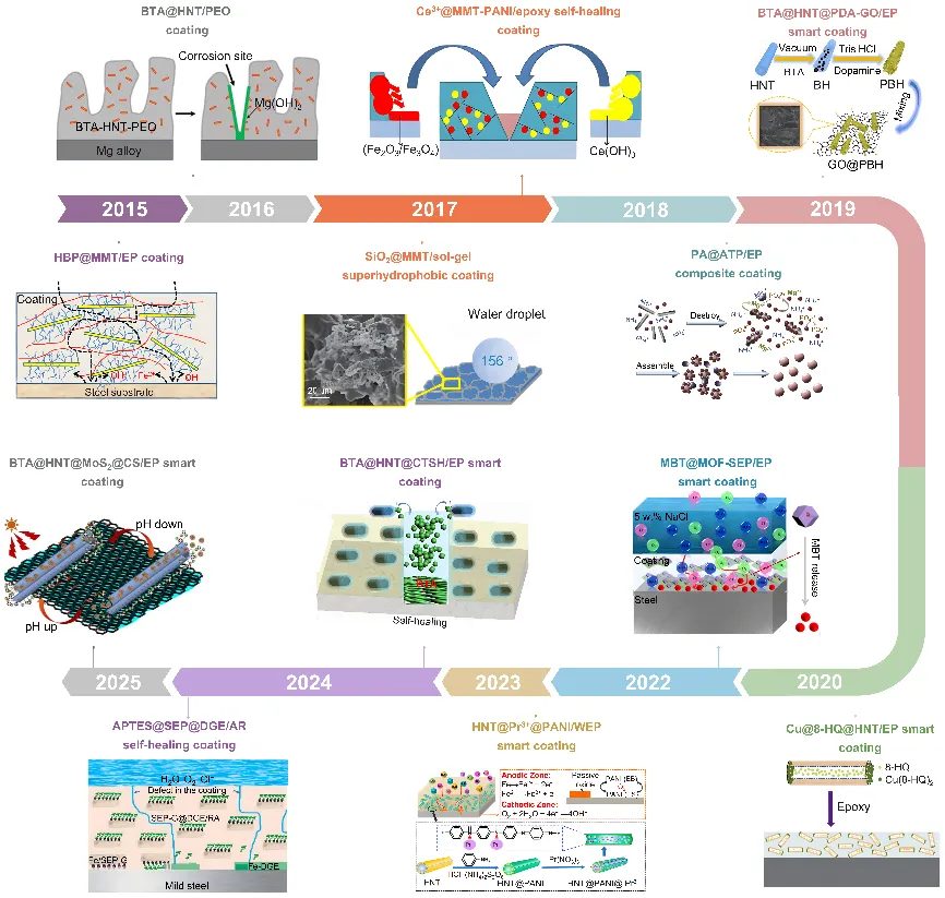 金属腐蚀是一个全球性的经济和安全问题,每年造成的损失高达约2.5万亿美元。有机涂层是目前最常用的防腐手段,但其在固化和服役过程中产生的微孔和裂纹会降低防护效能。纳米粘土因其独特的层状/管状结构、高长径比和化学稳定性,被视为理想的涂层填料。 然而,未经处理的纳米粘土易团聚且与基体相容性差。因此,如何通过改性提高其分散性,并利用其孔隙结构构建具有自修复能力的智能防腐涂层,成为了当前的研究热点。