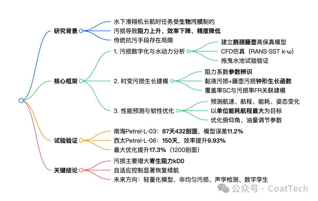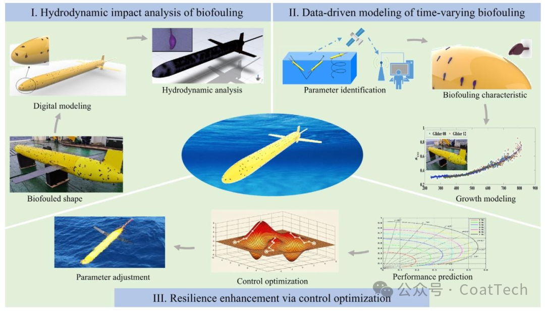 Ocean Engineering 本文以天津大学 Petrel‑L 水下滑翔机为研究对象,提出一套数据驱动的时变海洋生物污损建模与系统韧性提升框架,通过高保真污损形态建模、CFD 水动力分析、海试参数辨识构建污损生长模型,再基于该模型制定自适应导航优化策略,经南海与西太平洋实海试验证,可使航行效率提升约 9.9%,有效缓解长航时任务中污损导致的水动力效率下降、续航衰减问题。(文章链接:https://doi.org/10.1016/j.oceaneng.2026.125431) 水下滑翔机是海洋观测的 “长航时侦察兵”,能连续数月、数千公里自主作业。可一个看不见的杀手,正让它越游越慢、越飞越费电 ——海洋生物污损。最近,天津大学团队在《Ocean Engineering》发表一项成果,用数据驱动 + 自适应控制,给水下滑翔机装上 “智能抗污损大脑”,实海测试直接把航行效率拉回9.9%,彻底解决长航时任务的最大痛点。 图1:时变生物污损作用下水下滑翔机的数据驱动研究框架 阻力暴增、航速暴跌,3 个月效率直接掉 25% 航线跑偏、传感器精度下降,甚至完不成任务 传统防污涂层治标不治本,在线调参又费电又贵 精准还原南海最常见的藤壶形态 把机身分成 3 大区域、758 个附着点 用 CFD 流体仿真算清:污损主要影响航行阻力,对升力几乎没影响 拖曳水池试验验证,误差最低仅7.93% 图2:Petrel‑L 水下滑翔机生物污损形态建模 图3:拖曳水池试验示意图 图4:三种污损生物的布置方式及试验现场 区分两种污损:黏液长得快(82 天全覆盖),藤壶长得慢 用海试大数据训练时间生长函数,提前预测阻力变化 预测准确率高,和实测对比误差仅11.2% 目标:单位能耗飞得最远 实时优化:下潜 / 上浮俯仰角、油量调节参数 算法:多种群遗传算法智能匹配最优控制 图5:生物污损对 Petrel‑L 水下滑翔机运动性能参数的影响 南海 87 天、432 个滑翔剖面:验证污损模型高度可靠 西太平洋 150 天长任务:自适应策略一上,航行效率提升 9.93% 重度污损状态下,最大效率提升17.3%,续航直接 “回血” 图6:Petrel-L-03 号水下滑翔机的布放与回收 图7:参数辨识结果与生长模型预测结果对比 首次把数字建模、海试数据、自适应控制打成一套完整框架 不换硬件、不加设备,靠算法就显著提升系统韧性 可直接移植到 Slocum、Seaglider 等主流水下滑翔机面向水下滑翔机时变生物污损建模与系统韧性提升的数据驱动框架