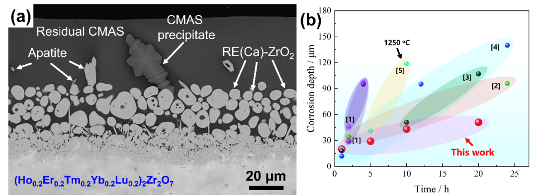 图 2 (a)(Ho0.2Er0.2Tm0.2Yb0.2Lu0.2)2Zr2O7高熵陶瓷在1300 ℃熔融CMAS腐蚀20 h后的截面形貌,(b)典型HE-REZs在1250和1300 ℃的腐蚀深度随时间的变化