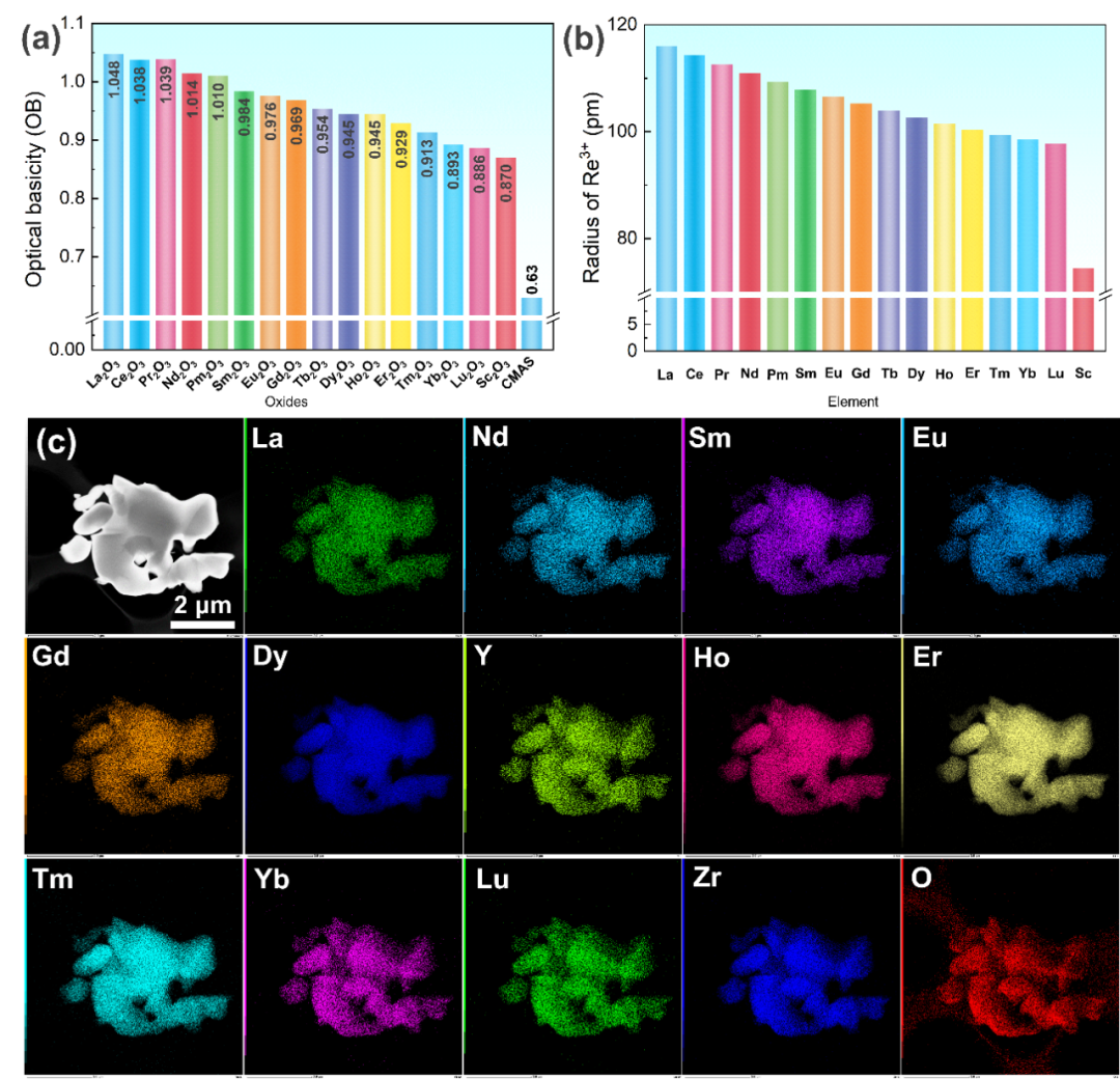 两款材料的核心创新在于揭示了“光学碱度调控+高熵效应”的协同增强机制:低光学碱度降低与CMAS的化学反应活性,高构型熵引发严重晶格畸变,显著抑制离子扩散与磷灰石相生成,双重作用共同赋予材料卓越的抗腐蚀性能。