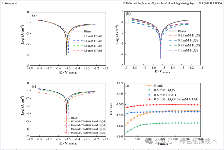 讨论:极化曲线表明,单独加入CTAB后,铝阳极腐蚀电位整体正移,阳极支电流密度明显下降,说明CTAB主要通过季铵盐阳离子头基吸附于金属表面、疏水长链向外取向形成屏障层,从而抑制阳极溶解。单独加入H2QS时,腐蚀电位略向负方向移动,但阳极和阴极电流密度均下降,说明其同时抑制阴极析氢和阳极溶解。二者复配后,腐蚀电流密度进一步降低,在0.6 mM CTAB + 0.5 mM H2QS条件下达到最低值1.7 mA·cm⁻²,极化法缓蚀效率达到94.19%。与此同时,开路电位更快在约100 s内趋于稳定,说明复合添加剂促进了保护层快速形成并提高了界面钝化程度。