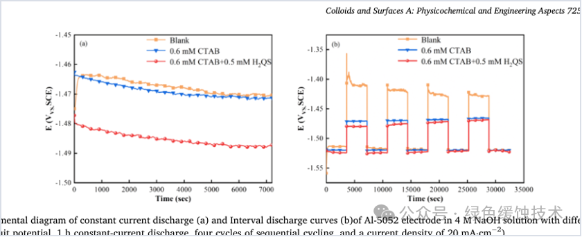 讨论:恒电流放电结果显示,加入复合添加剂后,Al-5052阳极的放电电位整体向更负方向移动,在0.6 mM CTAB + 0.5 mM H2QS条件下达到约−1.487 V,且放电平台更加平稳。这说明复合膜层虽然提高了界面阻抗、减缓了非放电腐蚀反应,但并未破坏有效放电所需的电化学活性。间歇放电曲线进一步表明,复配体系在多次开路—放电循环过程中仍可维持稳定的电位响应和较好的恢复能力,说明界面保护层具有较好的动态稳定性。论文据此认为,CTAB/H2QS体系在抑制析氢自腐蚀的同时改善了阳极有效利用过程,从而提升了电池放电稳定性。