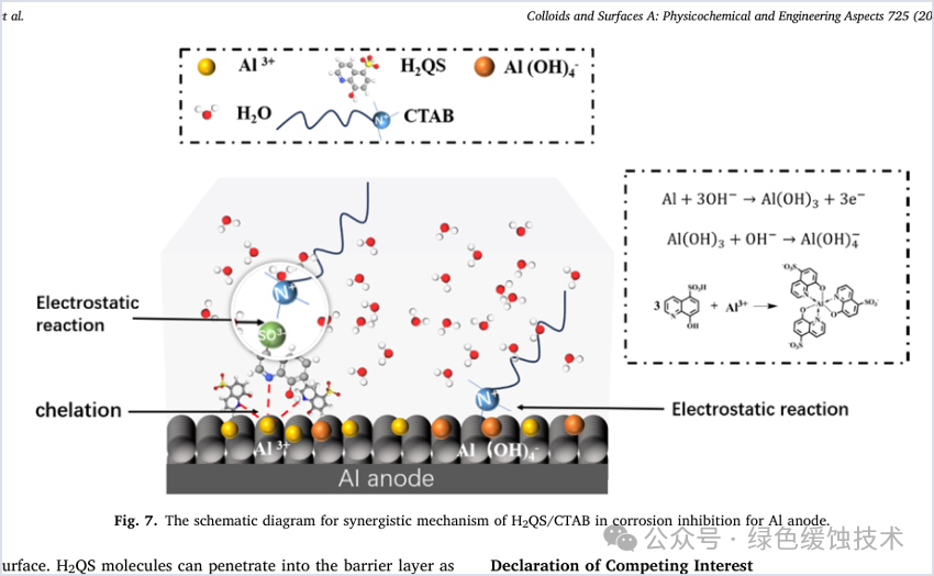 讨论:分子动力学结果表明,H2QS、CTAB及其复合体系在Al(111)表面的吸附能均随时间下降并逐渐稳定,其中复合体系的绝对吸附能最高,约为−760 kcal/mol,明显高于单一H2QS(约−700 kcal/mol)和单一CTAB(约−670 kcal/mol)。这说明二者在铝表面具有更强的协同吸附倾向。论文认为,这种增强作用来源于CTAB阳离子头基与H2QS极性基团之间的静电互补,以及疏水链段在空间排布上的优化。具体到机理上,CTAB先通过亲水头基占据表面活性位点,疏水尾链向外形成屏障层;H2QS则通过酚羟基氧和吡啶氮与Al³⁺配位,同时借助磺酸基与CTAB发生静电协同,从而填补单一CTAB膜层覆盖不足的缺陷,最终构筑出更均匀、更紧密的复合保护膜。
