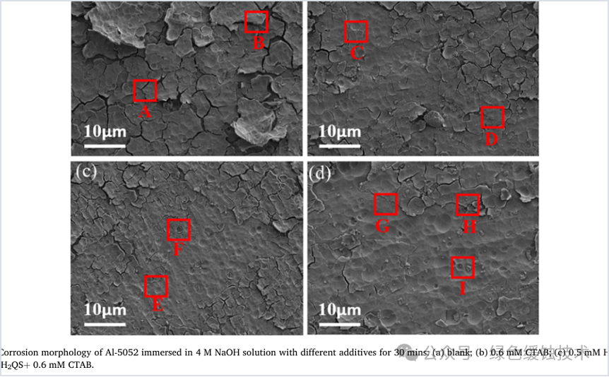 讨论:SEM结果表明,空白电解液中铝表面裂纹明显且腐蚀产物大量堆积,说明金属直接暴露于碱性介质后快速形成并脱落氧化物层,进一步加剧局部腐蚀。加入CTAB后,表面检测到Br元素,说明CTAB已吸附于铝表面并形成一定的有机屏障;加入H2QS后,表面出现S元素,表明H2QS参与了界面络合膜构建,但单独H2QS形成的膜层仍不够致密。复配体系下同时检测到Br和S元素,且裂纹数量和腐蚀产物均明显减少,说明CTAB与H2QS共同在铝表面形成了更完整的复合保护层,从形貌和元素组成两方面验证了协同成膜机制。