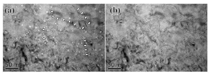 图9展示了RC316L-1Hf样品中He气泡沿位错线的分布形态(深度200-450 nm)。图9(a)为欠焦TEM图像,图9(b)为过焦TEM图像,白色箭头指示位错线上密集分布的纳米级He气泡,表明位错作为He气泡异质形核位点和有效陷阱。