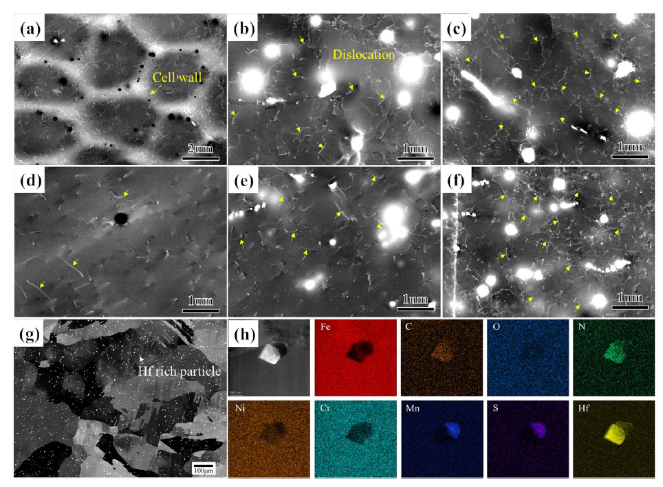图3展示了AB316L和RC316L系列中不同Hf浓度下的位错网络结构和富Hf析出相。图3a-c显示AB316L-0Hf存在高密度位错胞结构,而Hf掺杂样品中位错胞消失。图3d-f显示RC316L-0Hf经退火后位错密度降低,但RC316L-0.5Hf和RC316L-1Hf位错密度保持较高水平。图3g-h确认了富Hf析出相(HfC/HfN)的均匀分布和EDS成分。图