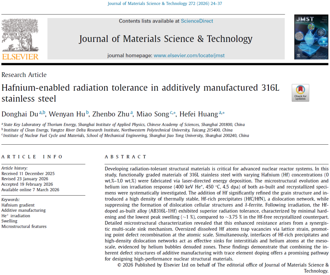 本文系统研究了通过激光定向能量沉积增材制造的Hf微合金化316L不锈钢在氦离子辐照条件下的微观结构演变和辐照耐受性。研究采用功能梯度材料设计,Hf浓度从0 wt.%到1.0 wt.%连续变化,并对增材态和再结晶态样品进行了对比分析。400 keV He⁺离子在450°C下辐照至约4.5 dpa,峰值He浓度约10 at.%。结果表明,Hf添加显著细化了晶粒结构(从~80 μm降至~8 μm),引入了高热稳定性的富Hf析出相(HfC/HfN),抑制了位错胞状结构和δ-铁素体的形成,同时位错网络得以保留。辐照后,AB316L-1Hf样品表现出最优异的辐照耐受性,峰值肿胀仅约1%,而RC316L-0Hf的肿胀高达约3.75%。多尺度微观表征揭示了这种增强抗性的协同机制:原子尺度上,过大的固溶Hf原子通过晶格应变场捕获空位,促进点缺陷复合;介观尺度上,富Hf析出相的非共格界面和高密度位错网络作为空位和He原子的有效陷阱,形成了明显的He气泡无沉淀区。晶界虽然密度随Hf添加增加(从0.016 μm⁻¹增至0.125 μm⁻¹),但微米级晶粒尺寸远高于50-100 nm的超细晶阈值,其作为缺陷陷阱的效率有限。δ-铁素体在AB316L-0Hf中提供了一定辐照抗性(BCC结构固有优势),但在高Hf样品中体积分数降至0.3%而贡献次要。