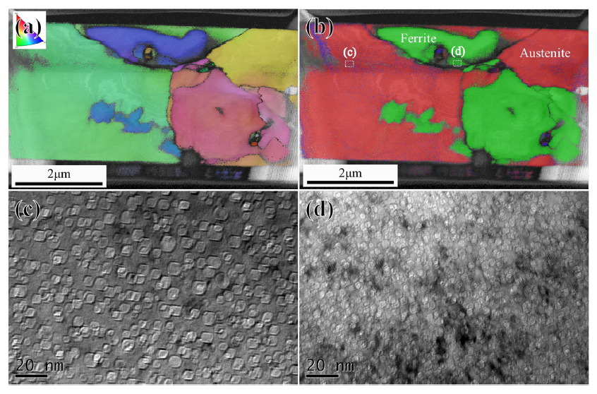 图11展示了AB316L-1Hf样品中δ-铁素体和奥氏体的TKD表征及He气泡分布对比。图11(a)为IPF图,图11(b)为相图,图11(c)显示奥氏体中存在较大He气泡(6.3±1.4 nm),图11(d)显示δ-铁素体中气泡尺寸小一半但数密度高2-3倍,表明BCC结构的δ-铁素体具有更优的抗肿胀能力。
