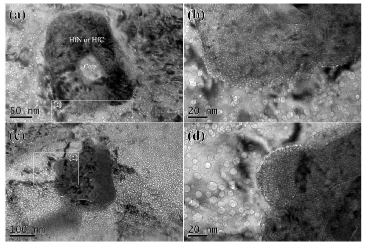 图12展示了AB316L-1Hf样品中不同损伤区富Hf析出相内部及周围的He气泡分布。图12(a-b)为远离峰值损伤区的析出相,图12(c-d)为峰值损伤区的析出相。在析出相界面附近观察到明显的“无沉淀区”,气泡密度显著低于基体,证实了非共格界面作为点缺陷有效陷阱的作用。