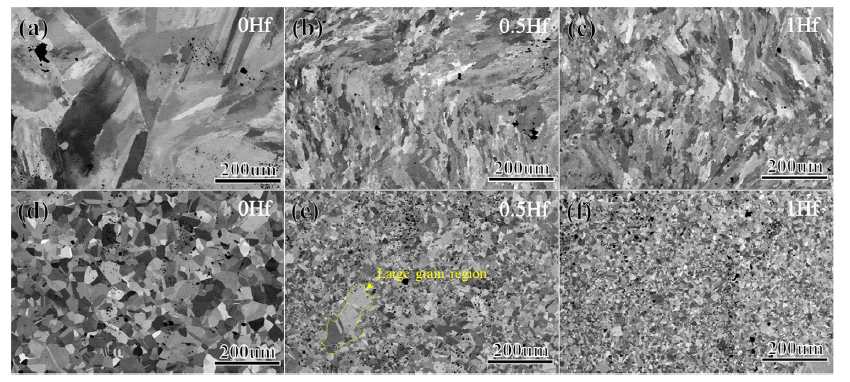 图2展示了AB316L和RC316L系列中不同Hf浓度(0 wt.%、0.5 wt.%、1.0 wt.%)的BSE显微组织。AB316L系列(图2a-c)呈现增材制造典型的柱状晶组织,0Hf样品晶粒粗大,添加Hf后晶粒显著细化。RC316L系列(图2d-f)为等轴晶组织,0Hf平均晶粒尺寸~12 μm,Hf添加后细化至~2.5 μm。图