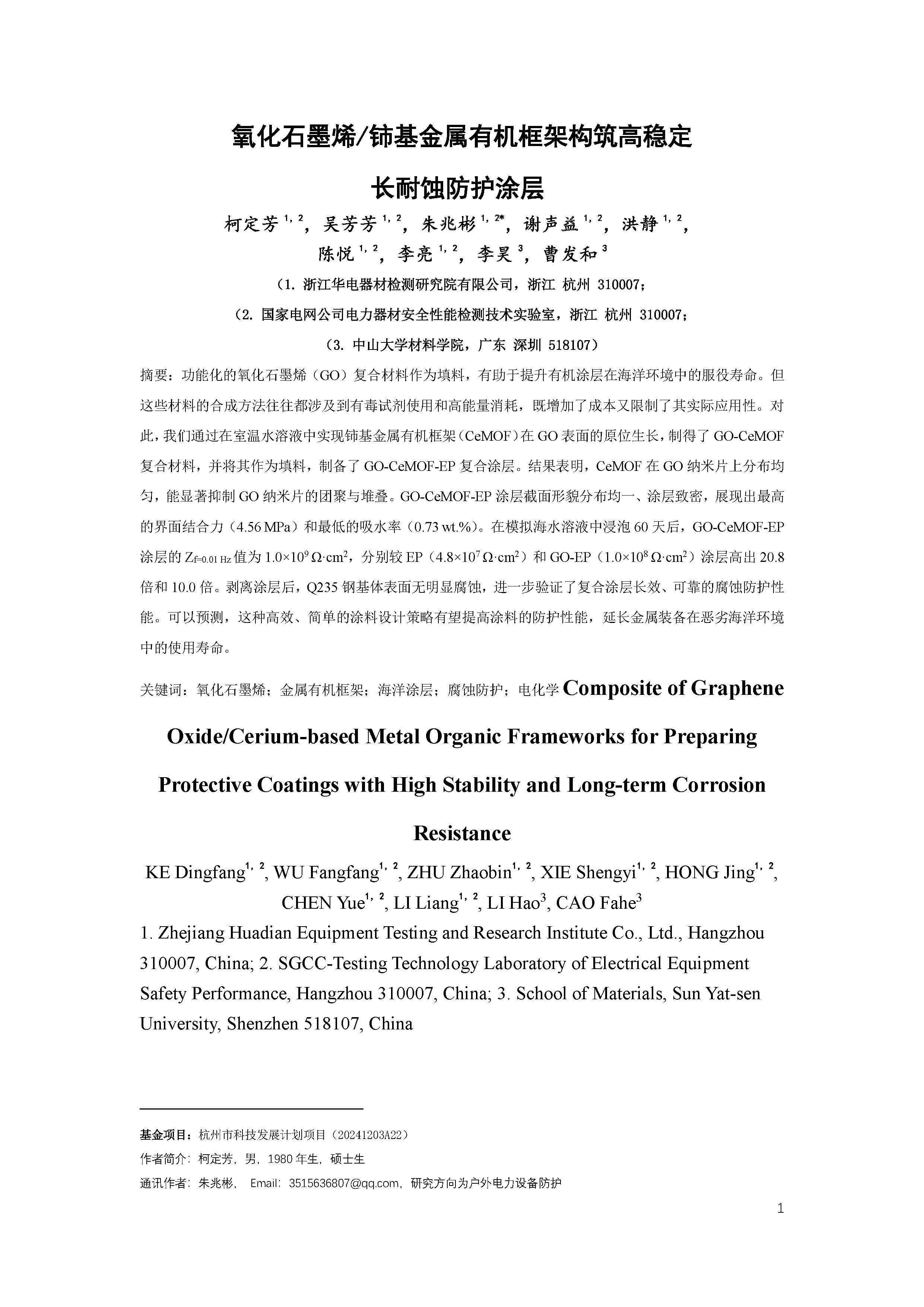 氧化石墨烯/铈基金属有机框架构筑高稳定长耐蚀防护涂层