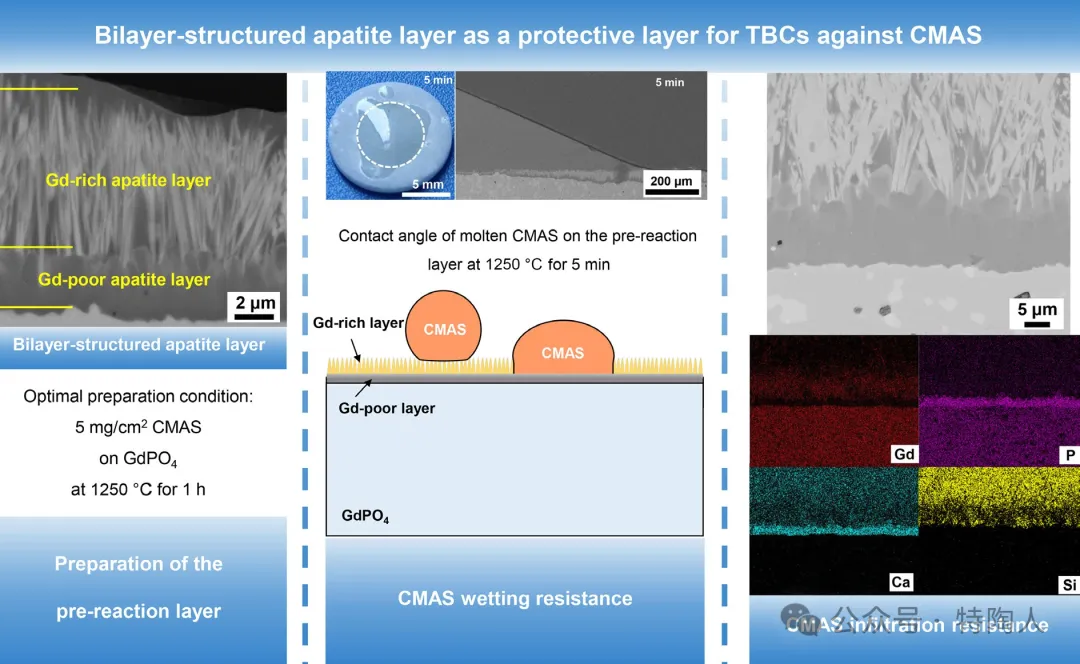 为打破这一瓶颈,本研究提出了一种通过界面反应构筑双层结构磷灰石防护层的新策略。该方法利用GdPO4CMAS粉末的预反应,通过精准调控反应温度、时间和CMAS浓度,实现防护层的原位构筑。该磷灰石层具有独特的双层结构,它是由针状顶层和致密底层组成,不仅显著降低熔融CMAS在表面的润湿性,实现疏CMAS效果,还能有效阻止CMAS渗透。