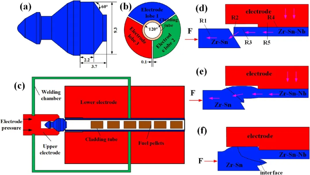 图1展示了焊接实验的设计与接头成形原理。图1a-c分别为端塞、下电极的尺寸及焊接装配示意图,清晰表明了电流从包覆管流经接触面到达端塞的路径。图1d-f则通过示意图生动描绘了从初始装配、通电加热塑性变形到最终完成的接头成形全过程,强调了接触电阻产热和顶锻力驱动变形的主导作用。