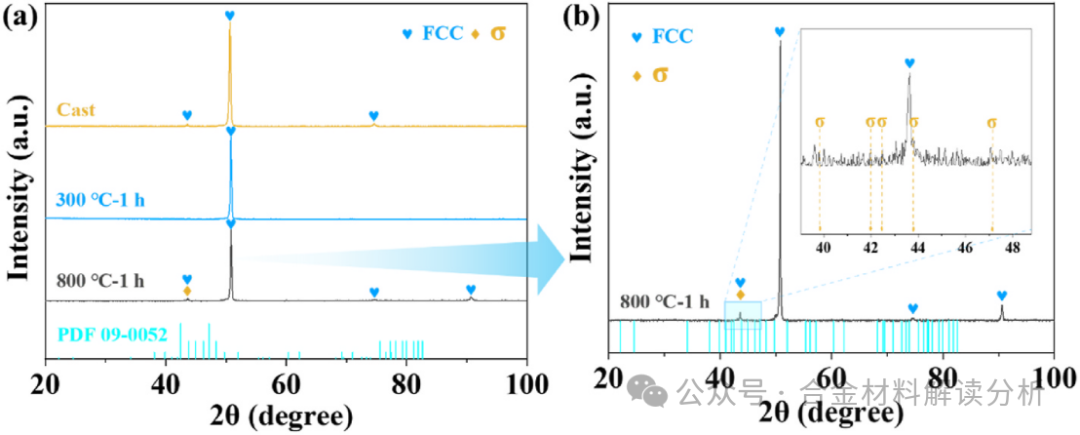5Co29Cr31Cu4Mn15Ni21高熵合金在铸态和不同温度时效1 h条件下的XRD图谱:(a)铸态、300 °C时效1 h800 °C时效1 h样品的XRD图谱;(b800 °C时效1 h样品的XRD图谱。在试样中观察到σ峰和面心立方(FCC)峰。