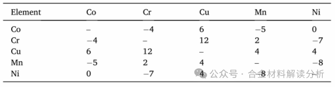 1CoCrCuMnNi各元素之间的混合焓(ΔHmixkJ/mol)。