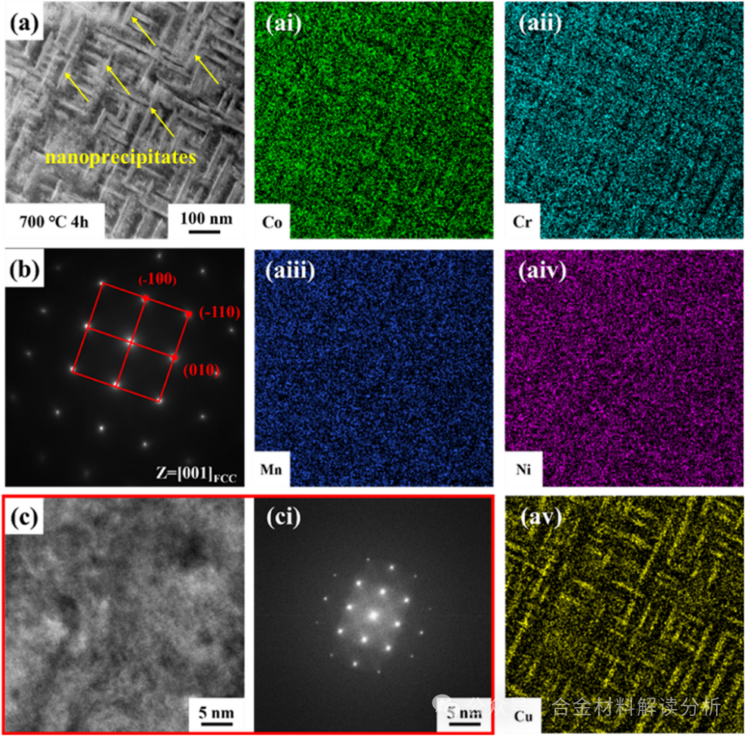 8Co29Cr31Cu4Mn15Ni21高熵合金在700 °C时效4 h的透射电镜表征:(a)扫描透射明场图像及相应的元素分布图,显示高密度富Cu纳米颗粒的均匀分布;(b)从图8a所示整个区域获得的选区电子衍射花样;(c)高分辨透射电镜图像及相应的快速傅里叶变换分析,表明纳米析出相与基体共格。