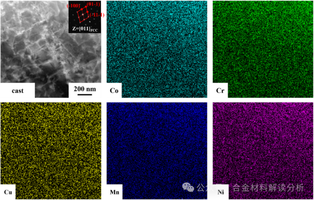 10:铸态Co29Cr31Cu4Mn15Ni21高熵合金的微观结构:扫描透射明场图像及相应的元素分布图。插图中的衍射花样从扫描透射图像所示的整个区域获得。