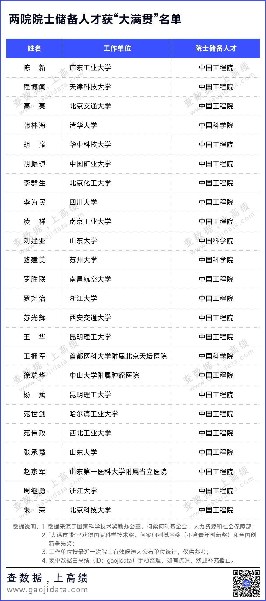 另需说明的是,本文所列学者工作单位为该学者在最近一次中国科学院、中国工程院院士增选有效候选人名单中的工作单位,与现职单位可能存在出入,信息仅供参考。