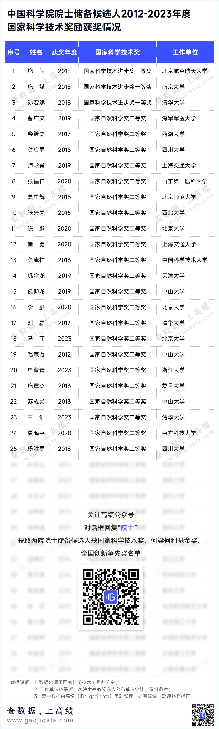 根据两院院士增选指南,高绩(ID:gaojidata)对近5届有效候选人名单进行筛选,筛选原则如下: