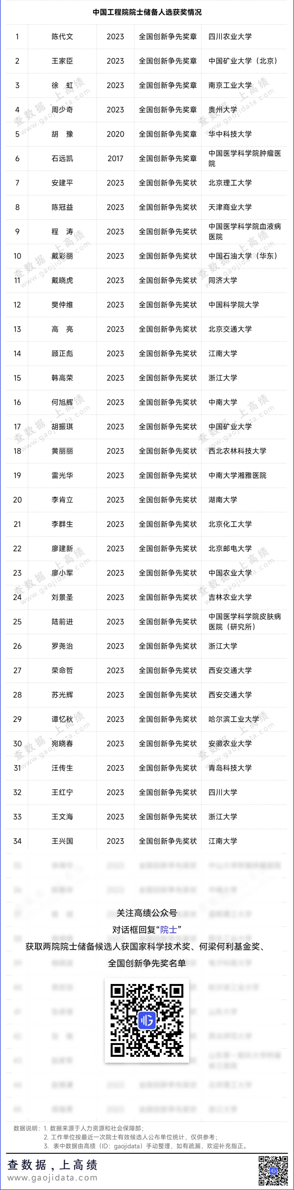 两院院士储备候选人获全国创新争先奖情况如下: