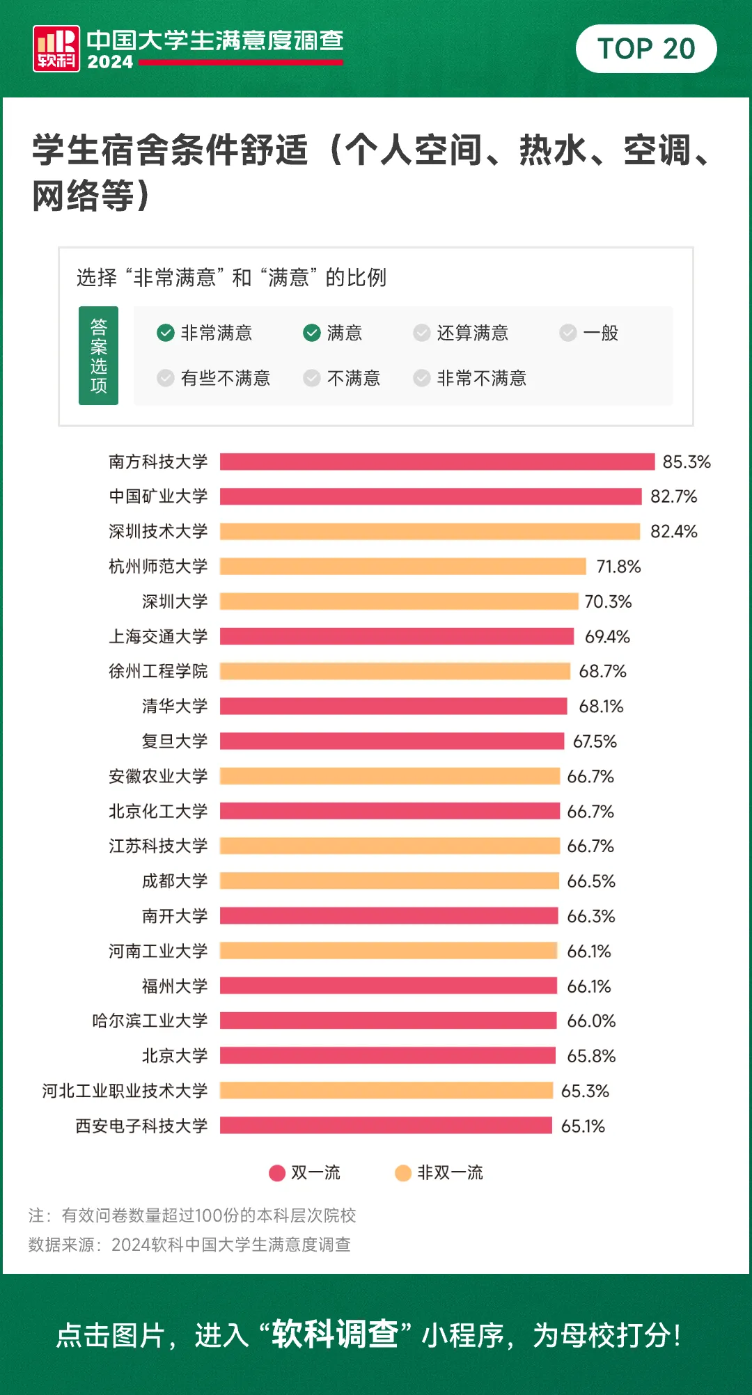 2024年5月,2024软科中国大学生满意度调查结果出炉,揭晓了中国大学生关注度最高的项目,以及分别在这些项目上满意度最高的20强高校,多所大学问鼎“全国第一”:在食堂项目上获得全国第一的清华大学,在学生管理项目上满意度位居第一的深圳大学,在奖励评选方面满意度最高的上海交通大学,在校园环境项目中位居全国第一的武汉大学,在结交朋友方面满意度最高的北京理工大学。