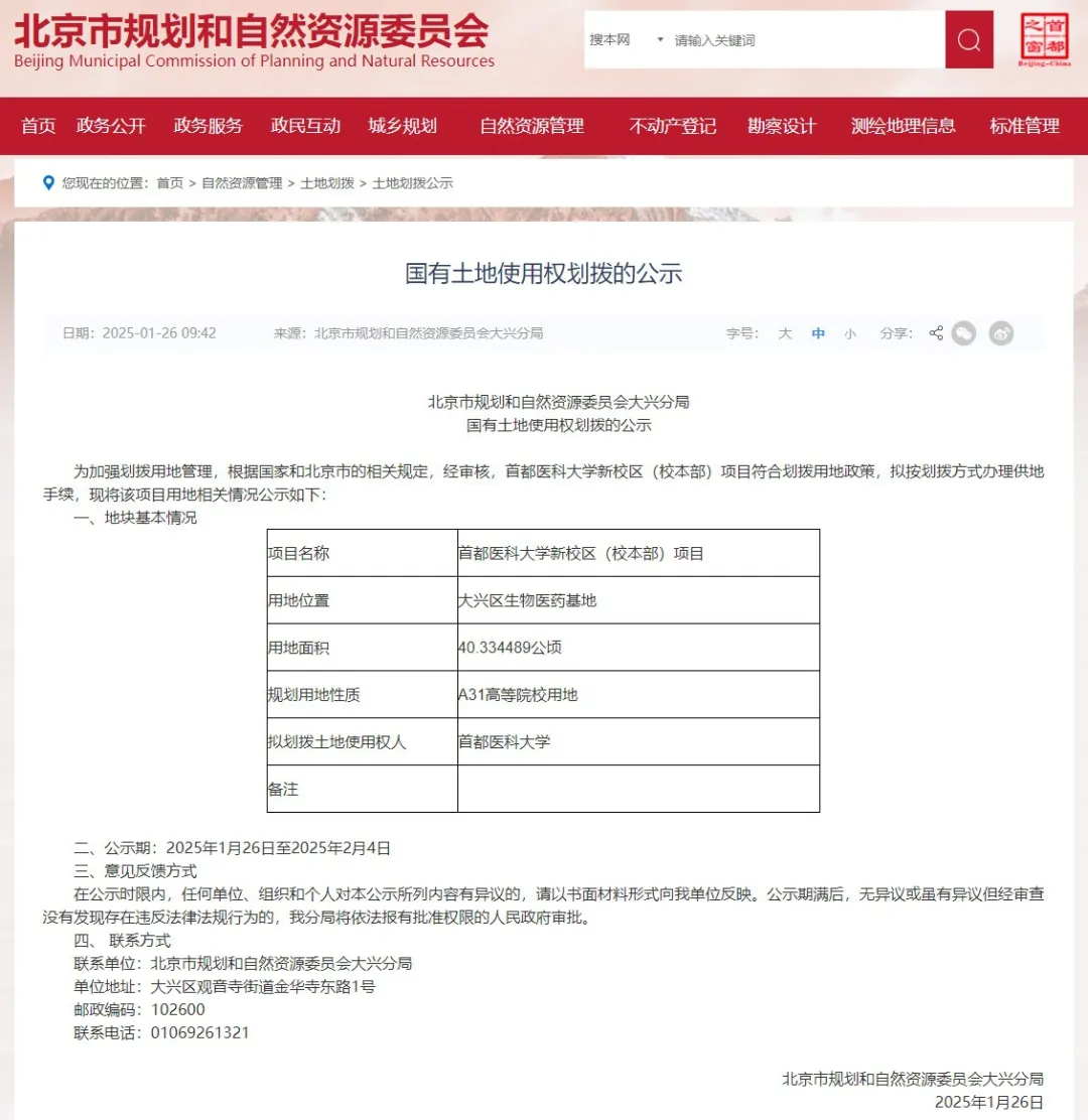 1月26日,北京市规划和自然资源委员会大兴分局发布国有土地使用权划拨的公示,拟划拨40.334489公顷作为首都医科大学新校区(校本部)项目建设用地,用地位置为大兴区生物医药基地。与此同时,首都医科大学新校区项目也已纳入北京市2025年“3个100”市重点工程计划。