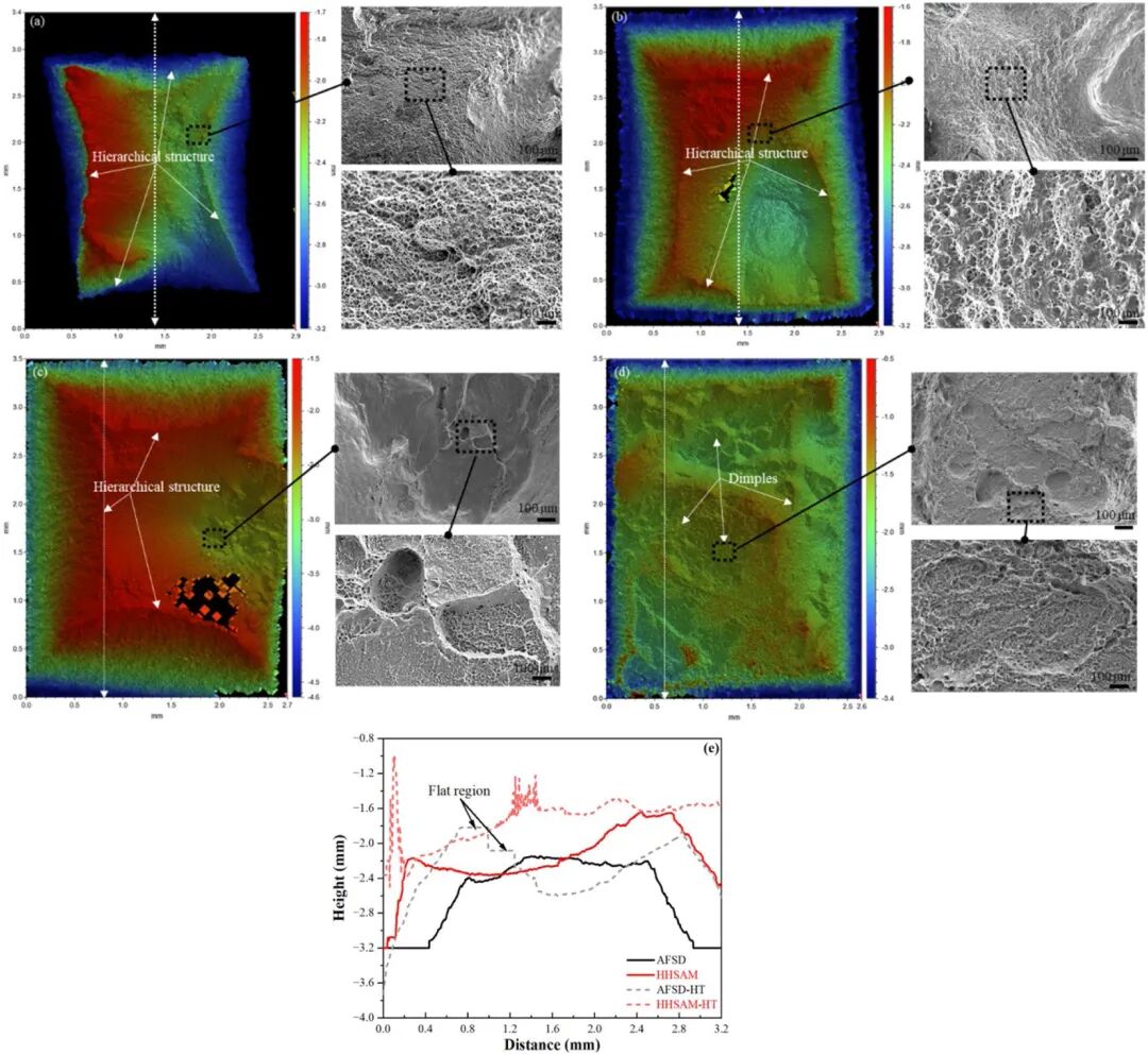 图10:各种沉积物断口表面的3D图像和高倍SEM图像:(a)AFSD、(b)HHSAM、(c)AFSD-HT和(d)HHSAM-HT;(e)沿(a)-(d)中每条标记线的2D扫描轮廓。