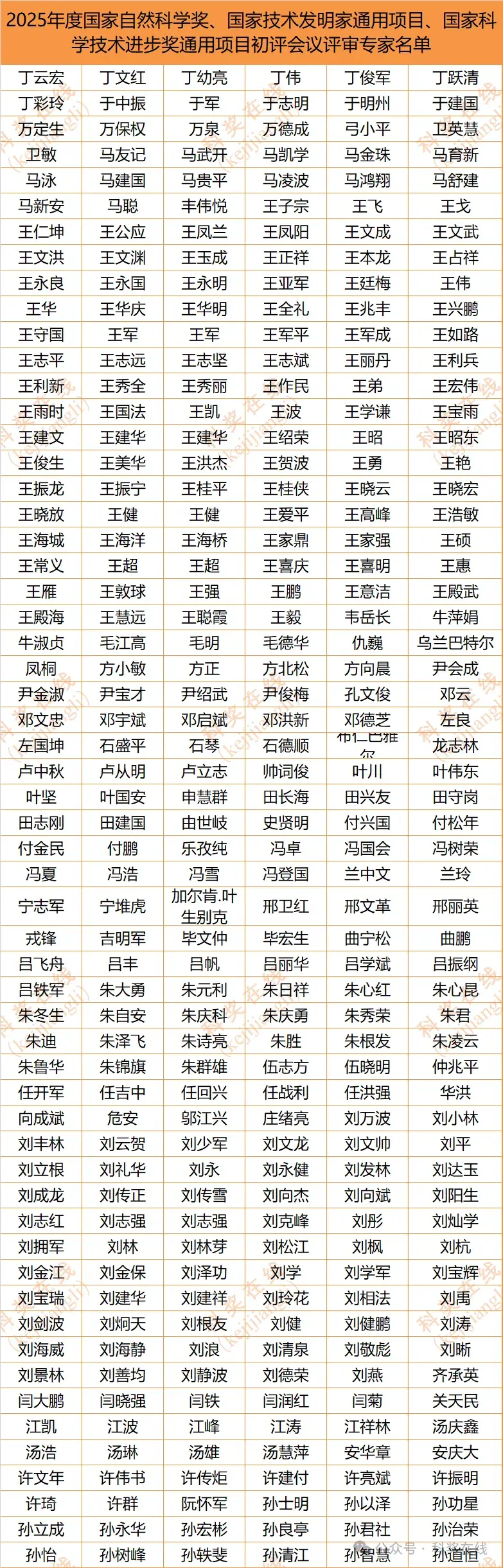 2025年度国家自然科学奖、国家技术发明奖通用项目和国家科学技术进步奖通用项目进行会议初评,有48个评审组、1078名评审专家,平均每组有22-23名评审专家。全部专家名单如下: