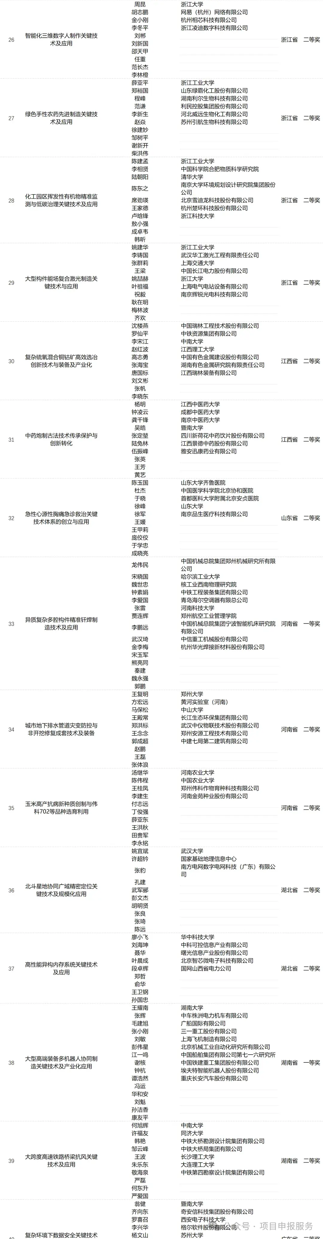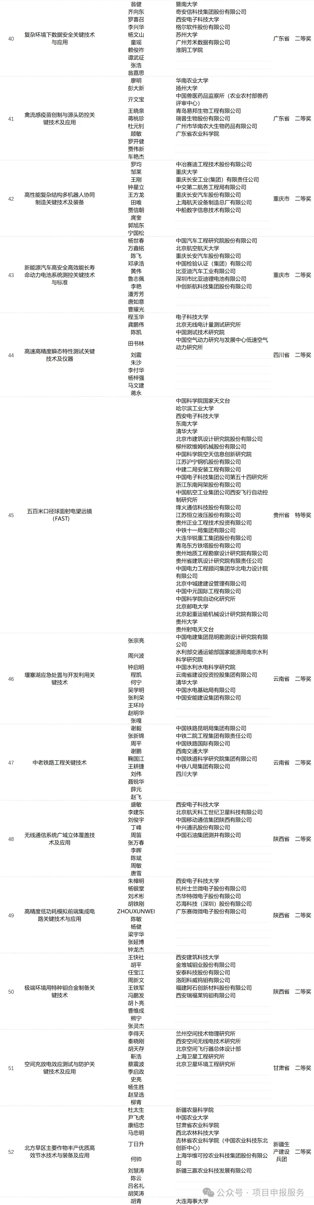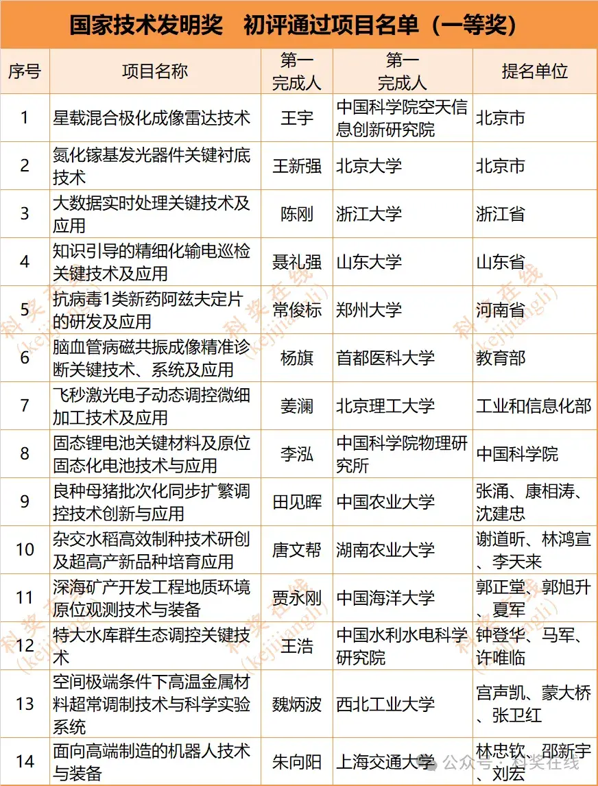 本年度通用项目中通过初评的特/一等奖数量46项,含自然科学奖一等奖6项,技术发明奖一等奖14项,科技进步奖特等奖10项、一等奖16项。名单具体如下: