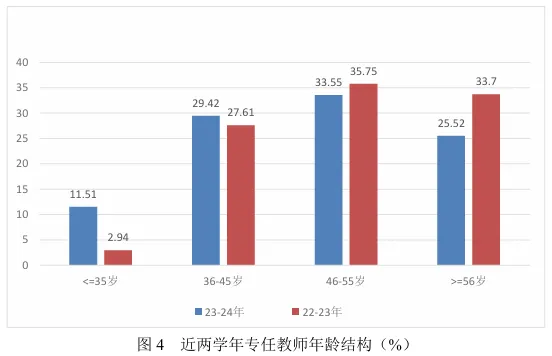 北京大学利用学校的国际合作交流网络,引进一批顶尖领军人才和优秀青年人才,青年人才在专任教师的比例数显著提升。其中,35岁及以下的专任教师占比由22-23年的2.94%上升到23-24年的11.51%。