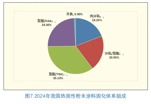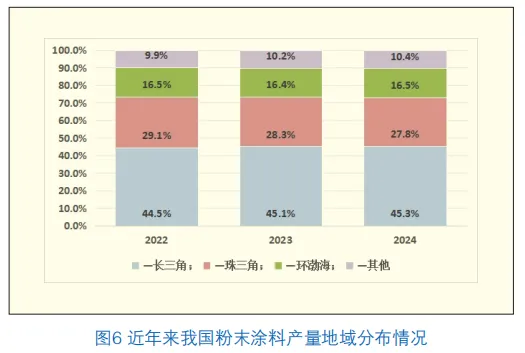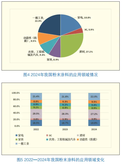 引言:2024年是新中国成立75周年,也是中国粉末涂料与涂装行业在复杂环境中迎难而上、开拓进取的关键之年。在国家“推进生态文明建设”“碳达峰、碳中和”等重大战略持续深化的背景下,绿色、低碳、可持续的发展理念已深入人心,成为推动经济社会转型的核心动力。这一切为行业带来新机遇的同时,也对我们提出了前所未有的新要求新挑战。这一年,随着国家“两新”政策(新基建与新消费)的逐步落地,消费市场活力增强,产业升级加速,绿色转型成效显著。这一年,随着“源头替代”工作的不断推进,涂料与涂装行业步入绿色发展新时期,越来越多的新兴领域开始关注并转向粉末涂装,市场上“漆改粉”乃至“水转粉”的呼声日渐升高。尽管粉末涂料传统应用领域面临较大的下行压力,但随着新兴领域的不断涌现,粉末涂料与涂装抓住了新的风口,继续保持增长态势。这一年,行业绿色制造体系不断巩固和发展,已有10余家企业获评国家级或省市级绿色工厂。这一年,中国粉末企业出海布局加速,已经有近20家企业在海外落地生根,不断拓宽国际视野,与世界一流企业同台交流,共谋发展。中国粉末涂料与涂装行业国际竞争力不断提升,继续引领着全球粉末涂料与涂装行业发展。 1.2024年我国粉末涂料行业运行概况 尽管当前房地产市场需求处于低谷,但“漆改粉”的转型浪潮却在工程机械、新能源(汽车、光伏、储能)、卷材、集装箱、输水管道等多个领域激发了粉末涂料需求的显著增长。随着国家生态环境部门大力推进源头替代,全面加强无组织排放控制,推进建设适宜高效治污设施,深入实施精细化管控,全面治理减排VOCs已经势在必行。业界也逐步兴起了以“能粉不水,能水不油,油推高固分”的原则,稳步推进大、中、小企业实施源头替代,倒逼涂装厂采用粉末涂装,这一现象近几年逐步增多,必将带来“液转粉”的加速,绿色发展为粉末涂料行业创造了最佳机遇期。 2024年颁布的涉及粉末涂料与涂装的重点政策有:①3月,国务院印发《推动大规模设备更新和消费品以旧换新行动方案》,旨在通过财政、金融等手段,刺激投资和消费,推动产业升级和绿色发展。②7月,在二十届三中全会精神指导下,工业和信息化部等九部门联合发布《精细化工产业创新发展实施方案(2024—2027年)》,重点推进涂料产业绿色转型,削减高VOCs涂料,推广粉末、水性等环保型涂料,促进技术创新,满足消费升级需求,助力美丽中国建设。③11月,江苏省人民政府发布《关于加快推动全省化工产业高质量发展的意见》,支持涂料等以物理加工为主要生产方式的区域特色产业进入合规园区整合集聚发展。 据中国化工学会涂料涂装专业委员会和全国涂料工业信息中心统计,2024年我国热固性粉末涂料销量265万t左右,比上年度增长6.6%(见图1)。综合来看,多数粉末涂料企业在2024年实现了净利润的提升,主要归因于原材料价格回落带来的成本压力缓解,整体毛利率水平有所改善。此外,部分企业还受益于销售收入的增长以及有效的成本管控措施,带动行业整体利润逐步修复。总体来看,粉末涂料行业仍处于成长期,但粗放式增长阶段已基本结束。 1.2 粉末涂料的应用领域变化 数据统计显示,在热固性粉末涂料领域,2024年建材(含暖通)粉末涂料市场份额为27.2%;一般工业用粉末涂料市场份额占22.3%;家电粉末涂料市场份额占18.8%;家具粉末8.9%;其他应用领域包括功能性(防腐)9.5%、农用工程机械及汽车9.4%、3C产品3.9%。2024年我国粉末涂料应用领域情况见图4,各领域整体走势见图5,基本与我国下游行业的运行情况及重点领域“漆改粉”趋势相一致。 1.3 粉末涂料地域分布情况 2024年长三角地区占45.3%左右,仍然占主导地位;珠三角地区占比27.8%左右,产量主要集中在广东省,广东省以建材、家电和五金为主(约占粉末用量80%左右),这几年受房地产、产业转移以及出口受限等因素影响,冲击比较大,整体呈下行趋势;环渤海地区占比16.5%,逐渐趋稳;中西部地区粉末涂料占比10.4%,高速增长几年后逐渐平稳(图6)。 1.4 粉末涂料固化体系的变化 统计显示,2024年我国热固性粉末涂料中,纯环氧粉末涂料占比19.2%,环氧/聚酯混合型粉末涂料20.5%,聚酯/TGIC型粉末涂料35.1%,聚酯/HAA型粉末涂料24.3%,其他类型粉末涂料占0.9%。总体来看,各体系之间占比切换主要受成本影响,纯聚酯体系粉末产品对其他常规体系替代进一步加大(图7)。2024年混合体系受TMA价格暴涨影响比较大。 2.1 建筑铝型材和工业铝型材呈冰火两重天态势 铝型材领域是粉末涂料应用的基石和最大的试验场。据中国有色金属加工工业协会发布数据,2024年我国建筑铝型材产量下降19.9%,工业铝型材产量增长23.2%,近三年建筑铝型材和工业铝型材一直呈现这种冰火两重天态势。反馈到上游粉末涂料领域,建材粉下行压力不断加大,价格战激烈;工业铝材对粉末的需求不断提升且产品迭代加速,因此需要粉末涂装协同工业铝材领域加强科技创新与产业创新融合,不断提高自主创新能力;加强新产品开发,培育新应用场景,助力持续扩大铝型材应用。 目前在建筑型材行业,受房地产下滑影响,工程铝型材用量减少,家装型材增多。家装市场特点主要以固定颜色为主,流行数个颜色,一般都会推荐几个主流颜色供客户选择,除非客户推出新的系列产品,才会有新的颜色。由于该特点,在颜色管理上相对容