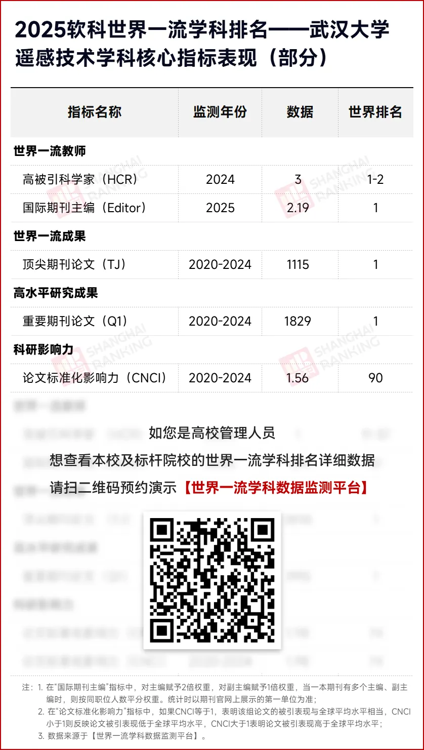 与该学科全球Top3高校的中值相比,武汉大学在遥感领域的强大统治力更得以体现——学校得分全方位超越上述标杆群体。