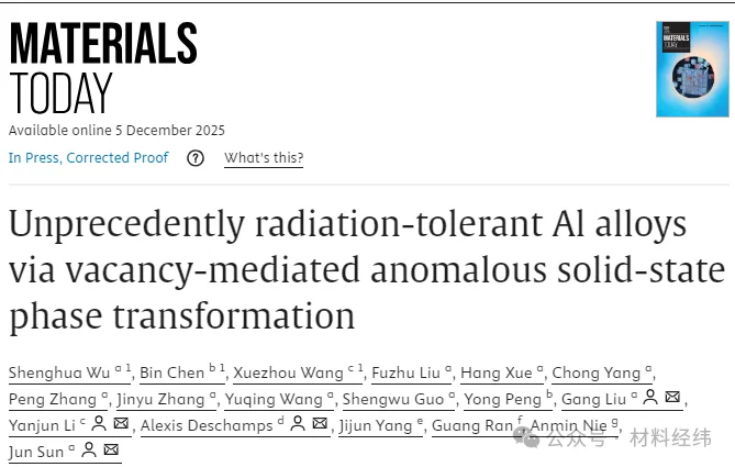 该成果以Unprecedently radiation-tolerant Al alloys via vacancy-mediated anomalous solid-state phase transformation为题发表于Mater. Today.