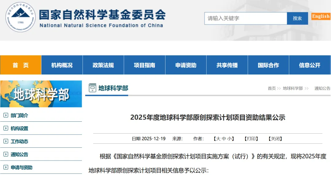 2025年度地球科学部原创探索计划项目资助结果公示