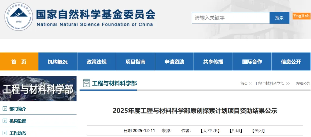 2025年度工程与材料科学部原创探索计划项目资助结果公示