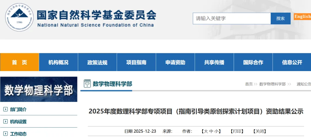 2025年度数理科学部专项项目(指南引导类原创探索计划项目)资助结果公示
