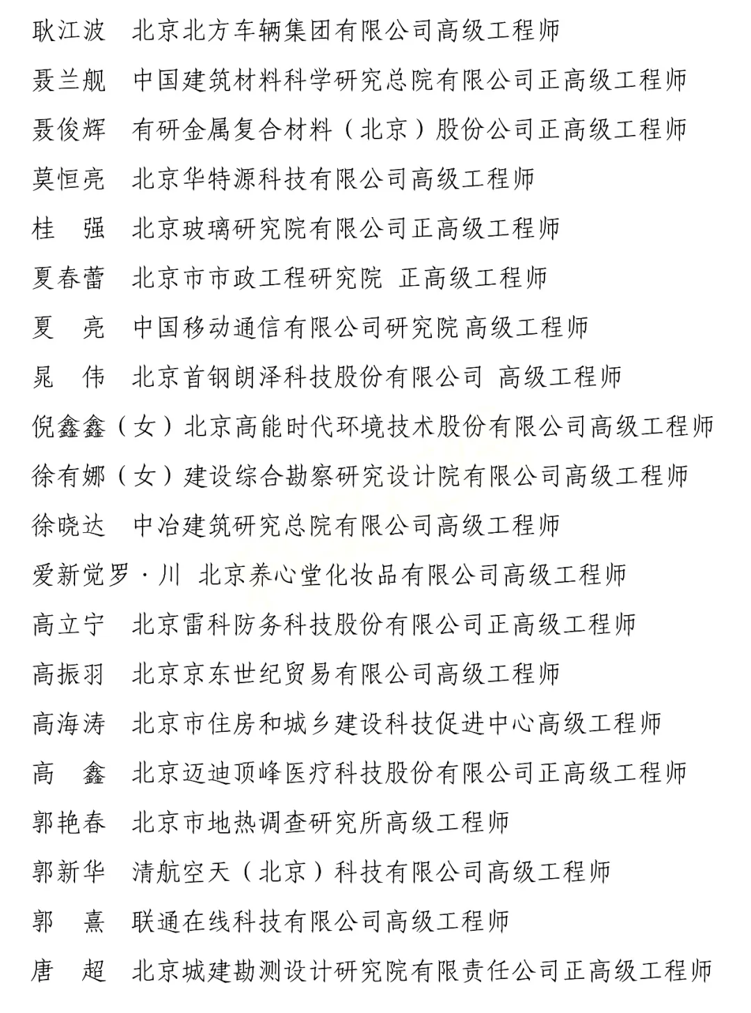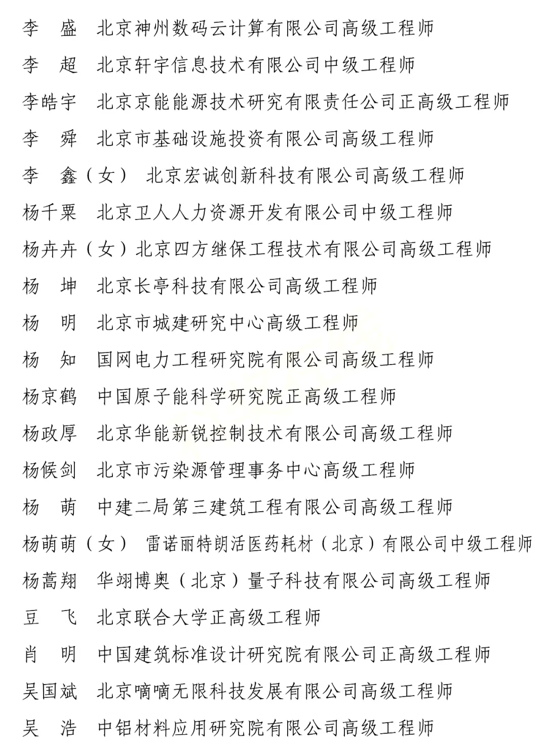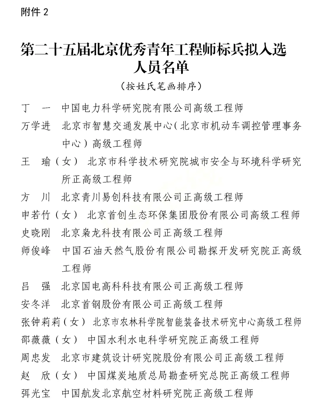 第二十五届北京优秀青年工程师表彰人选公示 按照《北京优秀青年工程师评选表彰工作方案》,北京市科学技术协会、北京市人力资源和社会保障局联合开展第二十五届北京优秀青年工程师评选表彰工作。经推荐、评审、考察,丁欢等229人拟入选第二十五届北京优秀青年工程师,丁一等19人拟入选第二十五届北京优秀青年工程师标兵。