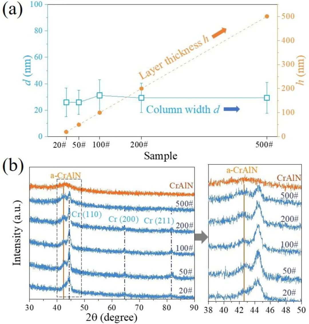 图2. (a)Cr/CrAlN纳米层状材料中的平均柱宽;(b)Cr/CrAlN纳米层状材料及单层CrAlN的XRD谱图。插图为38°–50°范围的放大区域。