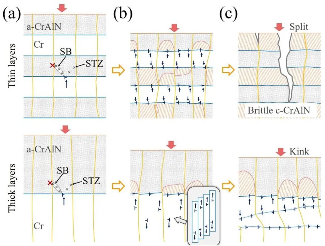 图10. Cr/CrAlN纳米层状材料在压缩过程中的变形机制示意图:(a)层状材料屈服;(b)塑性变形;(c)失效。